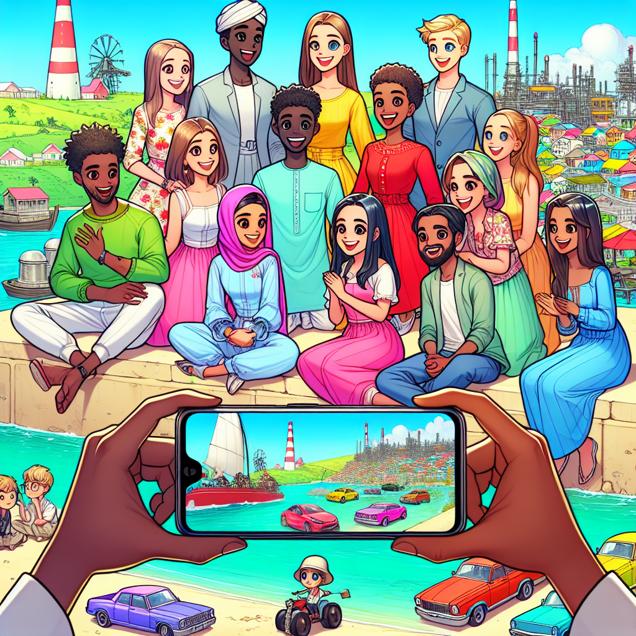 Prompt: Generate an image of a serene, bountiful Bermuda with a group of vibrantly dressed people drawn in a sweet and cute 2D animation style. They're gathered around a well-loved smartphone as they watch a captivating video by Technology Connections, exuding excitement and energy. In the background, depict traditional cars and everyday gadgets powered by petroleum, hinting at the burgeoning demand for such resources due to the stimulating content of the video. Show the scene in bright, cheerful colors to convey the allure of innovation and progress. The depiction should include only scenes, people, and objects, it should not include text or speech bubbles.