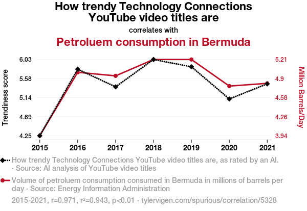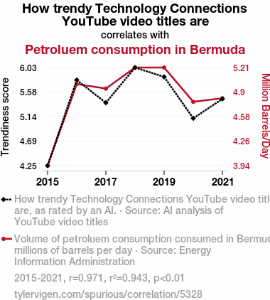 This means 94.3% of the change in the one variable (i.e., Petroluem consumption in Bermuda) is predictable based on the change in the other (i.e., How trendy Technology Connections YouTube video titles are) over the 7 years from 2015 through 2021.