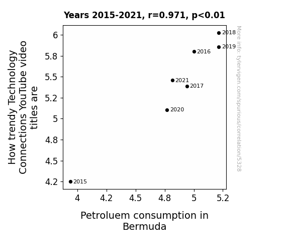 In conclusion, the unmistakable correlation between the trendy YouTube video titles of Technology Connections and petroleum consumption in Bermuda unravels a whimsical yet thought-provoking narrative, prompting us to contemplate the inexplicable ways in which the digital sphere interlaces with the physical realm. This unexpected caper through the vineyards of technology and the reservoirs of energy serves as a playful reminder that in the grand theater of research, the most surprising partnerships may hold the keys to unraveling enigmatic connections.