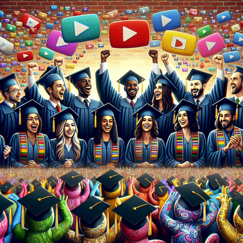 ChatGPT: Generate an image of a bustling graduation ceremony where a group of students proudly holds their Associates degrees in Business Administration. Surround the students with a flurry of colorful and attention-grabbing video thumbnails floating around them. Each thumbnail should bear exaggerated phrases and eye-catching imagery, representing the fusion of business acumen and internet savvy in the form of clickbait-y AsapSCIENCE YouTube video titles. The scene should exude a sense of celebration and achievement while incorporating the playful and attention-grabbing nature of internet culture.