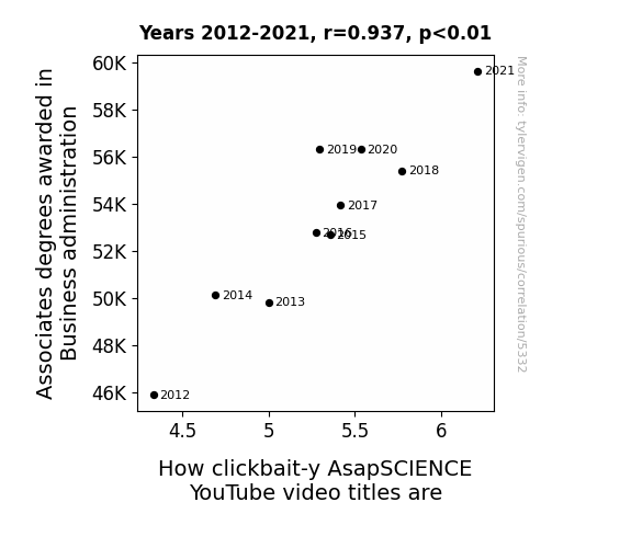User prompt: Please make up a funny explanation for how an increase in Associates degrees awarded in Business administration caused How clickbait-y AsapSCIENCE YouTube video titles are to increase.