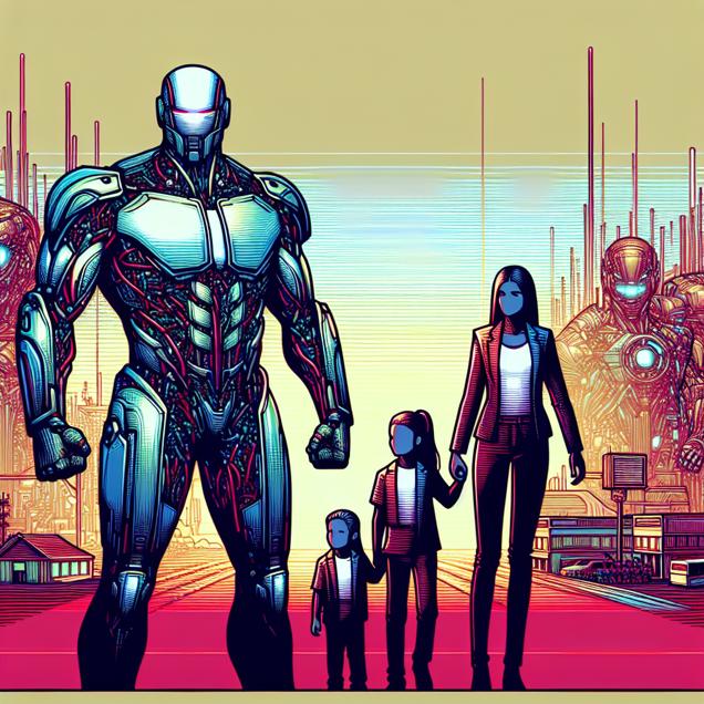 ChatGPT: Generate an image of a futuristic cyber folk gathering in Minnesota, featuring proud parents named Tatum standing alongside their daughters. The scene should convey a sense of strength and resilience as inspired by the tough characters portrayed by Channing Tatum in action movies. Show subtle hints alluding to the association of the name Tatum with toughness and its impact on the political landscape, reflecting a dynamic and enigmatic ambiance.