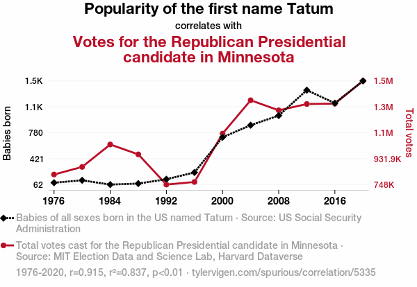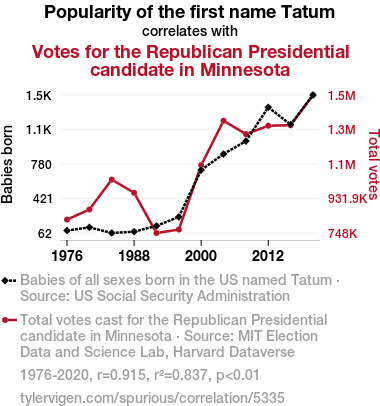 User prompt: Please provide potential search keywords for a paper titled A Tatum for Republican Success: An Analysis of the Connection Between Name Popularity and Political Leanings in Minnesota with an abstract of The present study delves into the captivating correlation between the popularity of the first name Tatum and the votes for the Republican Presidential candidate in the state of Minnesota. Utilizing data from the US Social Security Administration and the MIT Election Data and Science Lab, Harvard Dataverse, we conducted a thorough investigation from 1976 to 2020. Our findings reveal a remarkably robust correlation coefficient of 0.9146595 with a significance level of p < 0.01, highlighting a substantial association between the two variables.