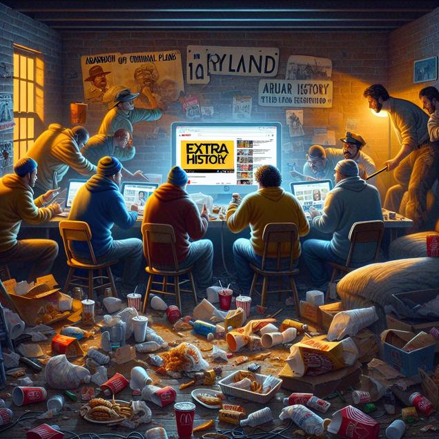 Prompt: The prompt could be improved by adding more visual details to enhance the scene. Try this: [ Realistic ] In Maryland, a group of would-be robbers are gathered in a dimly lit room, huddled around a computer with a tangle of wires and empty fast-food containers on the desk. They are avidly watching Extra History YouTube videos, their faces illuminated by the glow of the screen. Their expressions are a mix of fascination and excitement as they passionately comment on the videos. As their interest in historical animated content grows, the average number of comments on the videos steadily increases. However, as they decide to put down their criminal plans and focus all their attention on the show, they find themselves too enthralled to continue their previous activities. This unexpected turn of events leads to a noticeable decrease in robbery activities across the state, and the once messy room is now tidied up, with a change in the average number of comments on Extra History videos. The depiction should include only scenes, people, and objects, it should not include text or speech bubbles.