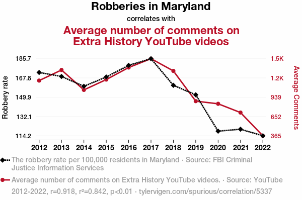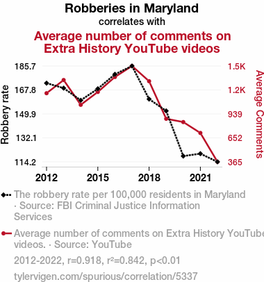 - The spurious research paper: An Unlikely Connection: Examining the Correlation between Robberies in Maryland and Comments on Extra History YouTube Videos
