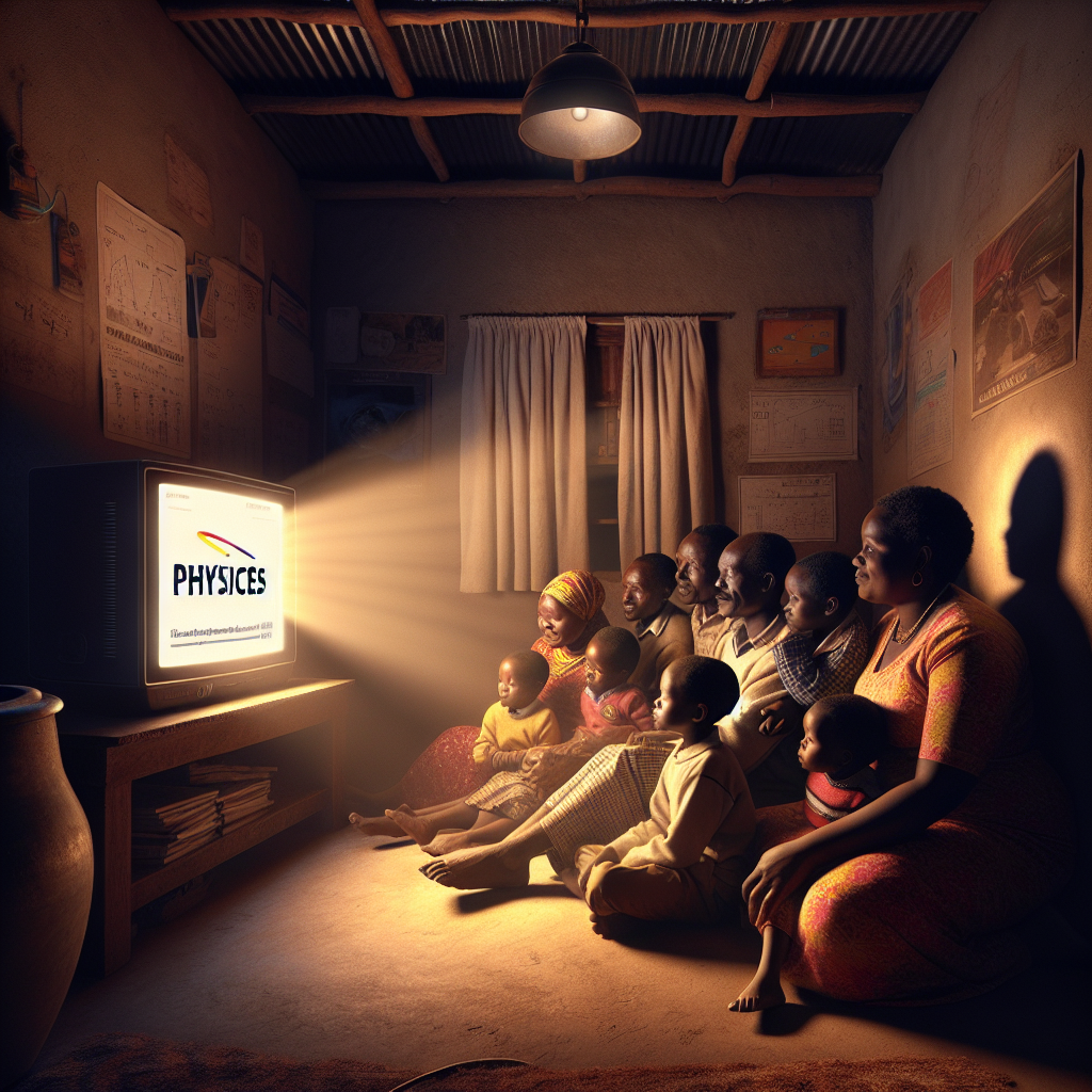 ChatGPT: [ A photo-realistic image ] Generate an image of a Tanzanian family gathered in a cozy room illuminated by the soft glow of a small screen showing minute physics videos. The warm light from the screen disperses across the room, casting gentle shadows as family members watch attentively. The diminishing need for traditional kerosene lamps becomes apparent as the room is bathed in the modern glow of technology, emphasizing the reduced demand for kerosene.