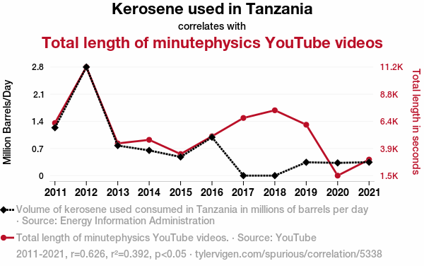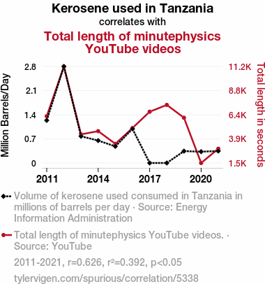 A linear line chart with years as the X-axis and two variables on the Y-axis. The first variable is Kerosene used in Tanzania and the second variable is Total length of minutephysics YouTube videos.  The chart goes from 2011 to 2021, and the two variables track closely in value over that time. Small Image