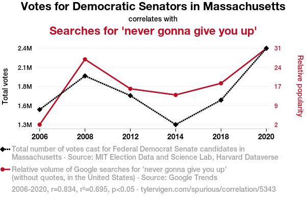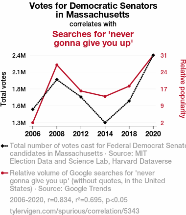 - The spurious research paper: Never Gonna Give Blue Up: The Correlation Between Massachusetts Democrat Senatorial Votes and 'Never Gonna Give You Up' Meme Popularity