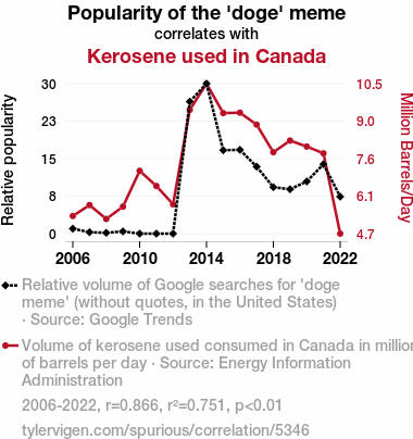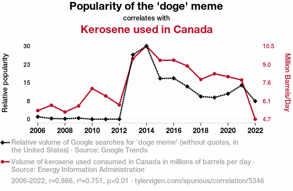 A linear line chart with years as the X-axis and two variables on the Y-axis. The first variable is Popularity of the 'doge' meme and the second variable is Kerosene used in Canada.  The chart goes from 2006 to 2022, and the two variables track closely in value over that time. Small Image