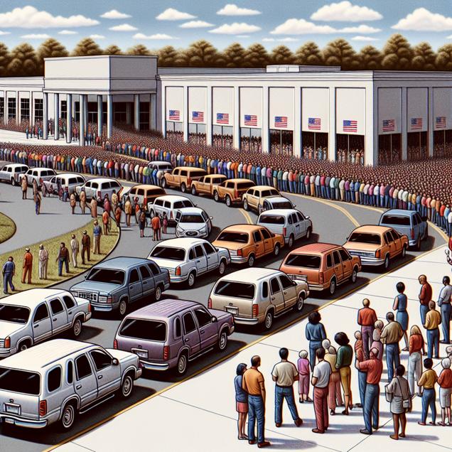 Prompt: Create a realistic image of a chaotic scene in South Carolina, where a line of cars with airbags deployed at random intervals and angles are causing chaos on the roads. In the background, depict voters proudly wearing "Libertarian" stickers on their shirts as they line up outside polling stations, eager to cast their ballots for the party's presidential candidate. The setting should capture the juxtaposition of the chaotic traffic and the determined voters, each element contributing to the overall scene's tension and energy. The depiction should include only scenes, people, and objects, it should not include text or speech bubbles.