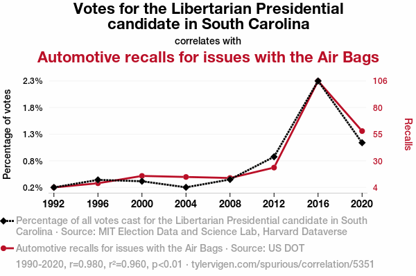 User prompt: Please provide potential search keywords for a paper titled Air Bags and Ballots: Exploring the Connection Between Libertarian Votes and Automotive Recalls in South Carolina with an abstract of In this study, we investigate the potential relationship between electoral preferences for the Libertarian Party's presidential candidate and the occurrence of automotive recalls related to air bag issues in South Carolina. Leveraging data from the MIT Election Data and Science Lab, Harvard Dataverse, and the US Department of Transportation, we conducted a comprehensive analysis covering the years 1990 to 2020. Our findings reveal a remarkably high correlation coefficient of 0.9797740 and a statistically significant p-value (p < 0.01), indicating a strong association between the two seemingly unrelated phenomena. This unexpected correlation prompts critical reflection on the interplay between political choices and automotive safety, inviting further interdisciplinary inquiry and, undoubtedly, a few eyebrow raises.