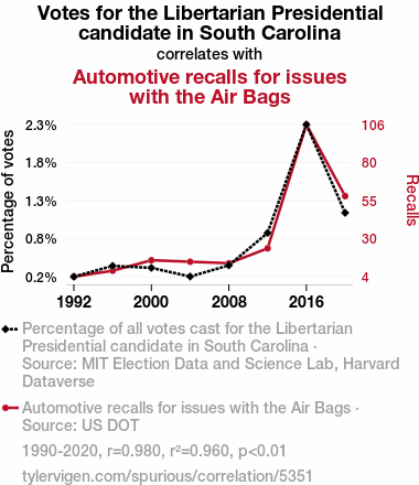 - The spurious research paper: Air Bags and Ballots: Exploring the Connection Between Libertarian Votes and Automotive Recalls in South Carolina