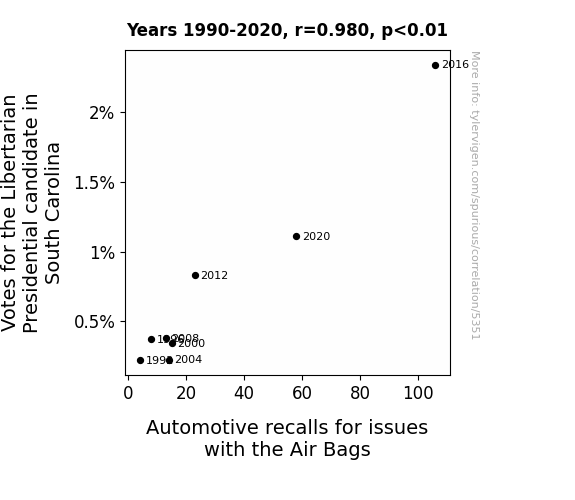 In this study, we investigate the potential relationship between electoral preferences for the Libertarian Party's presidential candidate and the occurrence of automotive recalls related to air bag issues in South Carolina. Leveraging data from the MIT Election Data and Science Lab, Harvard Dataverse, and the US Department of Transportation, we conducted a comprehensive analysis covering the years 1990 to 2020. Our findings reveal a remarkably high correlation coefficient of 0.9797740 and a statistically significant p-value (p < 0.01), indicating a strong association between the two seemingly unrelated phenomena. This unexpected correlation prompts critical reflection on the interplay between political choices and automotive safety, inviting further interdisciplinary inquiry and, undoubtedly, a few eyebrow raises.