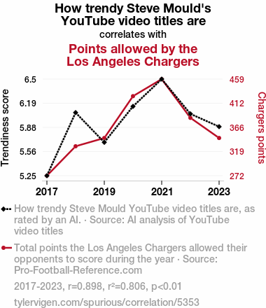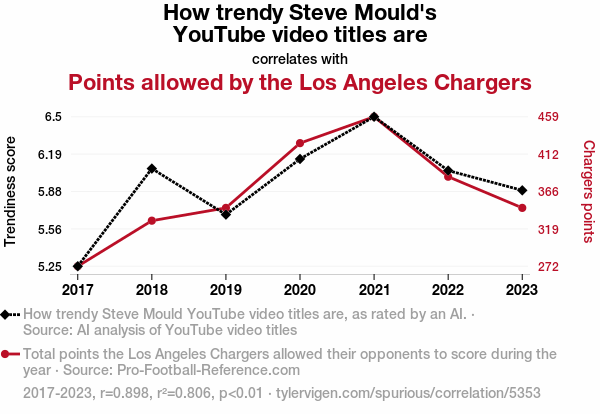 This study aims to investigate the intriguing connection between the trendiness of Steve Mould's YouTube video titles and the points allowed by the Los Angeles Chargers in professional football games. Data from 2017 to 2023 were subjected to AI analysis of YouTube video titles and extracted from Pro-Football-Reference.com to establish a correlation coefficient of 0.8980309 and p < 0.01. Our findings suggest a striking relationship between the whimsical creativity of YouTube video titles and the Chargers' performance on the field, prompting further investigation into the potential influence of viral trends on sports outcomes. Our research not only illuminates the unexpected interplay of digital media trends and sports statistics but also provides a lighthearted look at the impact of online content on real-world athletic endeavors.