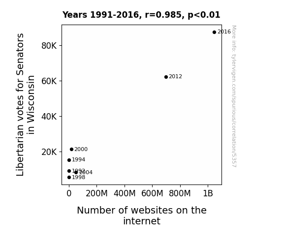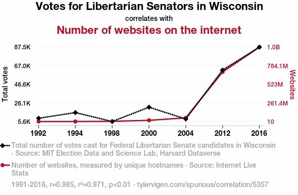 In scrutinizing the relationship between the number of websites on the internet and libertarian votes for Senators in Wisconsin, our study has unraveled an exceedingly high correlation coefficient of 0.9853660, signifying a robust and statistically significant link between cyber activity and political preference. The proverbial "world wide vote" takes on a new significance as our findings indicate a compelling interplay between the virtual web and the ballot box. While we've spun a convincing statistical yarn, it must be noted that correlation does not imply causation – after all, we'd be weaving quite the conspiracy theory if we suggested every website is a polling station.