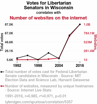 User prompt: Please provide potential search keywords for a paper titled A Study of Libertarian Electorate and Cyber State: Can Webs Unravel Votes? with an abstract of This paper investigates the intriguing relationship between the number of websites on the internet and the libertarian votes for Senators in Wisconsin from 1991 to 2016. Drawing on data from MIT Election Data and Science Lab, Harvard Dataverse, and Internet Live Stats, our research team explores whether a web of digital connectivity could, in fact, entangle the voting behavior of libertarian-leaning citizens. Through statistical analysis, we uncover a remarkably high correlation coefficient of 0.9853660 with statistical significance (p < 0.01), suggesting a strong connection between cyber activity and political behavior. Join us as we unravel the tangled link between online presence and political preference, bringing a new dimension to the phrase "surfing the web" in the context of senatorial votes.