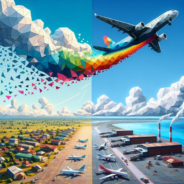 ChatGPT: Generate an image of a low poly scene where a sleek, geometric plane gracefully cuts through the clear, azure skies above Bakersfield, California. The plane emits a vibrant trail of multicolored geometric letters, forming an elegant message against the backdrop of the serene firmament. Meanwhile, in Samoa, a row of low poly planes lines the tarmac, waiting to be refueled with jet fuel in response to escalated demand. The simplicity of the low poly elements should convey the dynamic energy and bustling activity of the scenes.