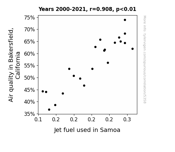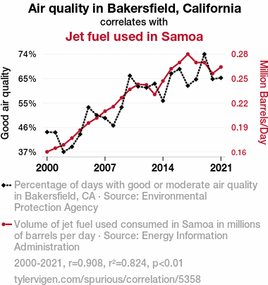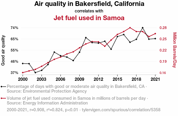 This means 82.4% of the change in the one variable (i.e., Jet fuel used in Samoa) is predictable based on the change in the other (i.e., Air quality in Bakersfield, California) over the 22 years from 2000 through 2021.
