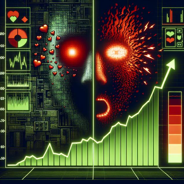 Prompt: Generate an image of a digital display split into two halves. On the left, we see bold red letters flashing The Game Theorists' YouTube video titles such as "SHOCKING" and "SURPRISING" against a dark background. The titles are surrounded by a dynamic pulse line graph with spikes representing the increase in viewers' heart rates. On the right, we observe the Dominion Energy stock price graph rising steadily in a vibrant green hue. In the background, an electricity usage meter indicates a sharp increase in demand, mirroring the energetic rise of Dominion Energy's stock price. The depiction should include only scenes, people, and objects, it should not include text or speech bubbles.
