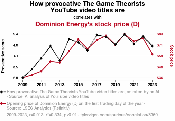 This means 83.4% of the change in the one variable (i.e., Dominion Energy's stock price (D)) is predictable based on the change in the other (i.e., How provocative The Game Theorists YouTube video titles are) over the 15 years from 2009 through 2023.