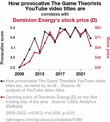 User prompt: Please make up a funny explanation for how an increase in How provocative The Game Theorists YouTube video titles are caused Dominion Energy's stock price (D) to increase.