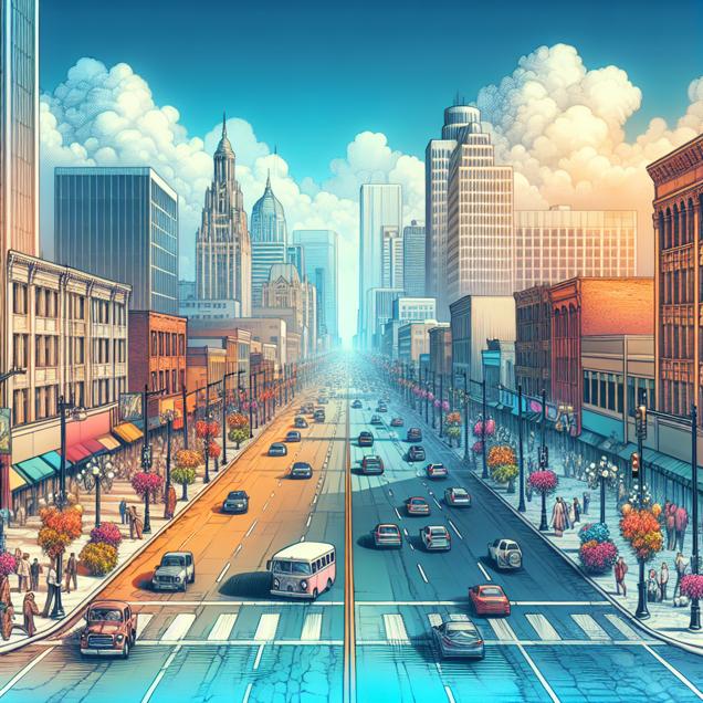 Prompt: Prompt: Generate an image of Lansing, Michigan's city streets with reduced air pollution and an evident decline in floral designers' presence. Show the transition of the city's landscape with a notable shift in job opportunities and a budding success in other professions as a result of the cleaner air. Infuse the image with a sense of transformation and rejuvenation in the urban environment. The depiction should include only scenes, people, and objects, it should not include text or speech bubbles.