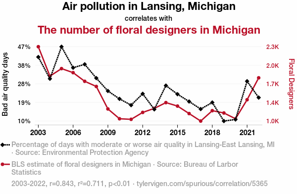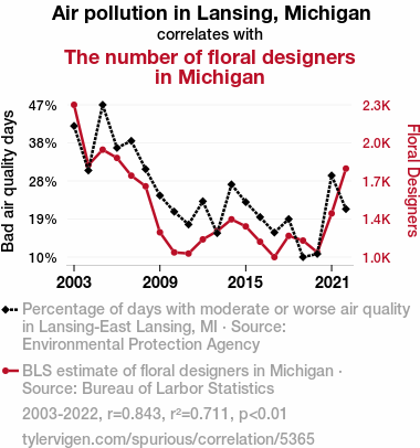 This means 71.1% of the change in the one variable (i.e., The number of floral designers in Michigan) is predictable based on the change in the other (i.e., Air pollution in Lansing, Michigan) over the 20 years from 2003 through 2022.