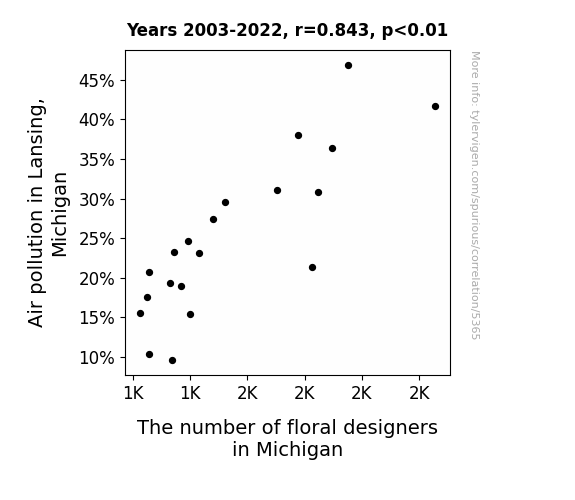 The results of our analysis revealed a striking correlation coefficient of 0.8432417 between air pollution levels in Lansing, Michigan, and the number of floral designers in the state. This strong positive correlation suggests that as air pollution increased over the years, so did the demand for floral designers, much like how flowers blossom in the spring – it seems the floral industry thrives in the face of adversity, or in this case, air contaminants. As my plant scientist friend likes to say, "it's a bloomin' miracle!"