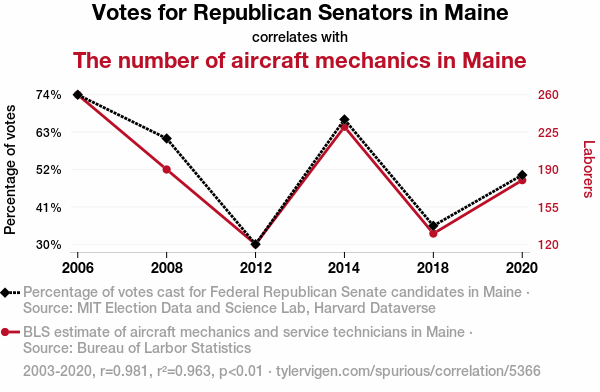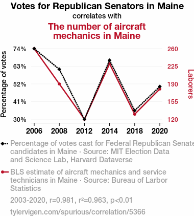 - The spurious research paper: Airborne Allegiance: The Correlation Between Republican Votes for Senators in Maine and the Number of Aircraft Mechanics
