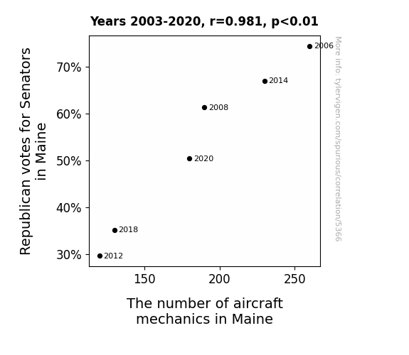 User prompt: Please provide potential search keywords for a paper titled Airborne Allegiance: The Correlation Between Republican Votes for Senators in Maine and the Number of Aircraft Mechanics with an abstract of In this paper, we delve into the curious connection between the political preferences of Maine's residents and the number of aircraft mechanics in the state. While it may seem like comparing apples and oranges, our rigorous analysis uncovers a statistically significant correlation that will take you to new heights - pun intended! Leveraging data from the MIT Election Data and Science Lab, Harvard Dataverse, and the Bureau of Labor Statistics, our research team explores the period from 2003 to 2020 and unveils a correlation coefficient of 0.9811501 with a p-value less than 0.01.