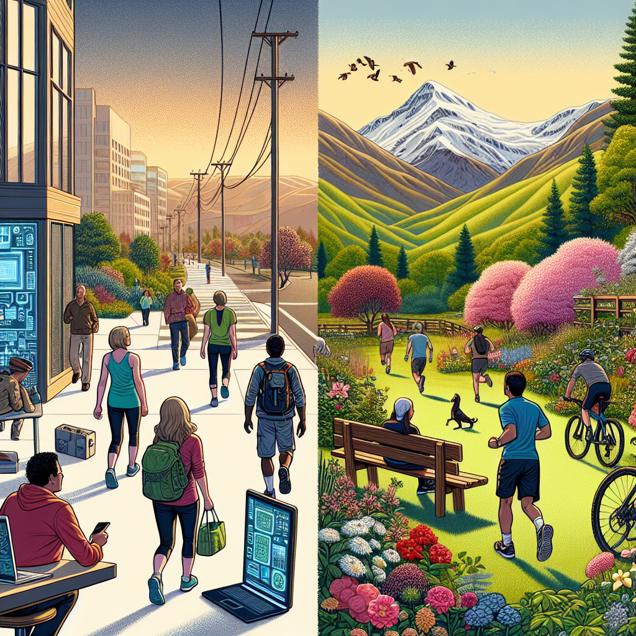 Prompt: Generate an image showing the transition in Hagerstown, Maryland from a tech-centric environment to a nature-loving community. Depict a serene landscape with individuals engaging in outdoor activities, such as hiking, running, and cycling, surrounded by lush greenery. Use clean lines and minimalist detailing to emphasize the shift from indoor to outdoor lifestyles, capturing the essence of the change in the local culture without the need for excessive details. The depiction should include only scenes, people, and objects, it should not include text or speech bubbles.