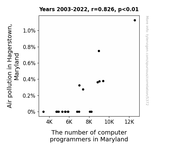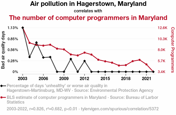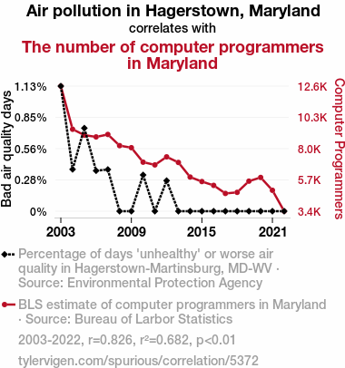- The spurious research paper: The Coding Conundrum: Unraveling the Relationship Between Air Pollution in Hagerstown and the Proliferation of Programmers in Maryland