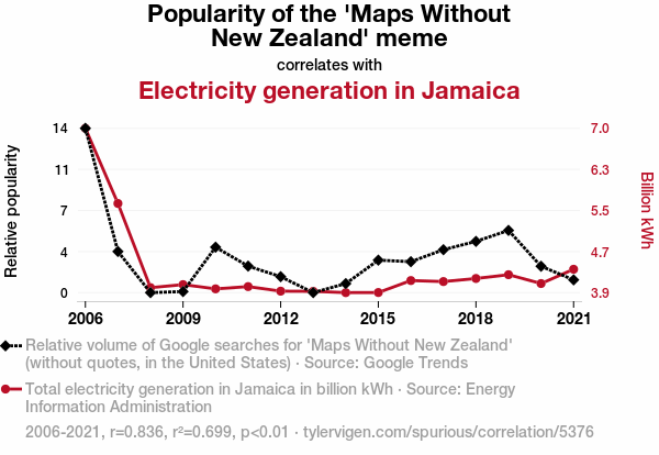 Google Trends, 'Maps Without New Zealand' meme, Jamaica electricity generation, correlation coefficient, Energy Information Administration, viral meme, power grid, relationship, online humor, electricity generation capacity