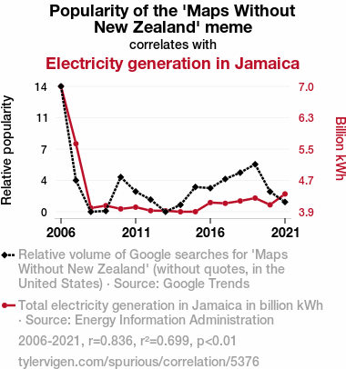 - The spurious research paper: Charting the Connection: The Shocking Link Between 'Maps Without New Zealand' Popularity and Jamaica's Electricity Generation Capacity