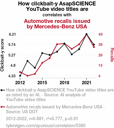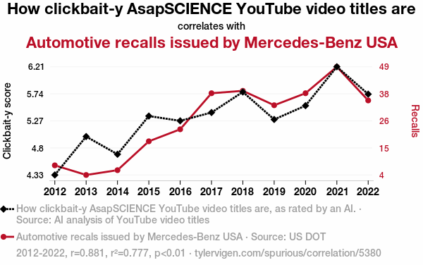 User prompt: Please provide potential search keywords for a paper titled The Clicks and the Recalls: A Correlation Between AsapSCIENCE YouTube Video Titles and Mercedes-Benz USA Automotive Recalls with an abstract of In this paper, we delve into the unlikely but intriguing connection between the clickbait-y nature of AsapSCIENCE YouTube video titles and the automotive recalls issued by Mercedes-Benz USA. We employ a blend of social media analytics and automotive data to explore this relationship, using AI analysis of YouTube video titles and United States Department of Transportation (US DOT) records to unravel this peculiar correlation. Our research team has discovered a correlation coefficient of 0.8812410 and p < 0.01 for the period spanning from 2012 to 2022, indicating a statistically significant association between the two seemingly unrelated phenomena.