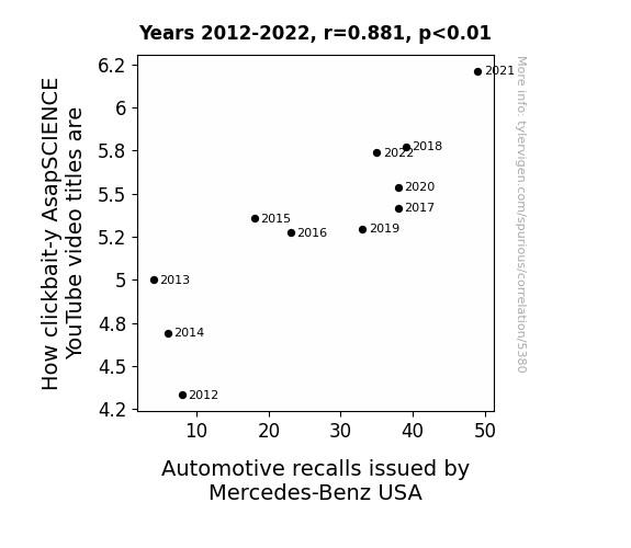 The statistical analysis of our data revealed a strong correlation coefficient of 0.8812410 between the clickbait-y nature of AsapSCIENCE YouTube video titles and the automotive recalls issued by Mercedes-Benz USA for the period spanning from 2012 to 2022. The r-squared value of 0.7765857 further underscored the robustness of this association, providing evidence of a noteworthy relationship between these seemingly unrelated phenomena. The p-value of less than 0.01 solidified the statistical significance of our findings, leaving little room to doubt the existence of a substantial connection.
