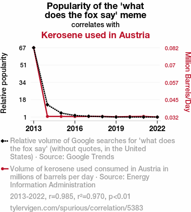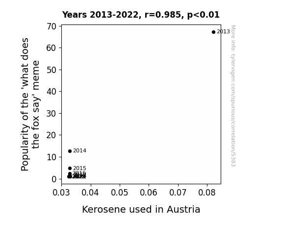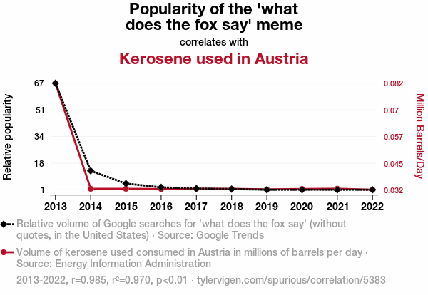 This means 97% of the change in the one variable (i.e., Kerosene used in Austria) is predictable based on the change in the other (i.e., Popularity of the 'what does the fox say' meme) over the 10 years from 2013 through 2022.