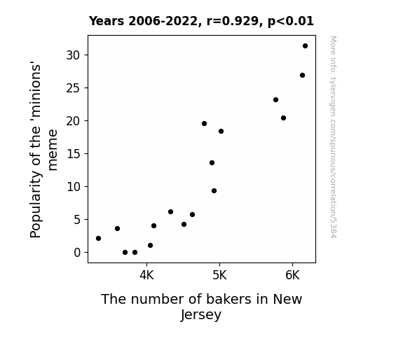- The spurious research paper: The Rise of 'Meme-ion' Bakers: Exploring the Dough-lightful Relationship Between the Popularity of 'Minions' Meme and the Number of Bakers in New Jersey