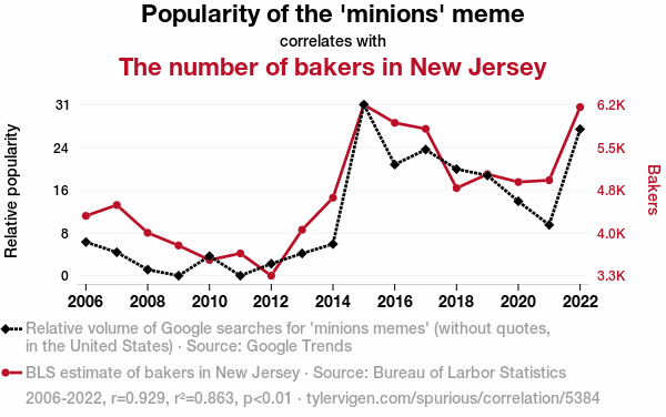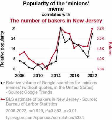 - The spurious research paper: The Rise of 'Meme-ion' Bakers: Exploring the Dough-lightful Relationship Between the Popularity of 'Minions' Meme and the Number of Bakers in New Jersey