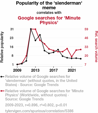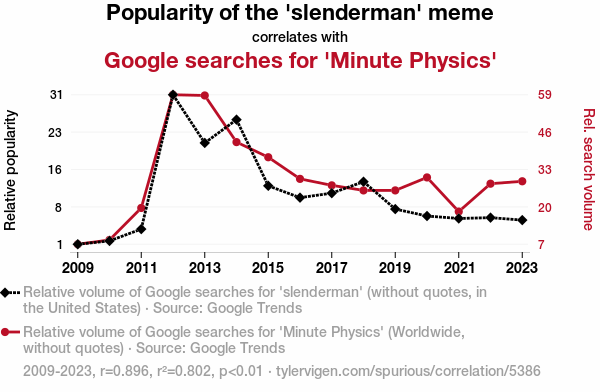 This means 80.2% of the change in the one variable (i.e., Google searches for 'Minute Physics') is predictable based on the change in the other (i.e., Popularity of the 'slenderman' meme) over the 15 years from 2009 through 2023.