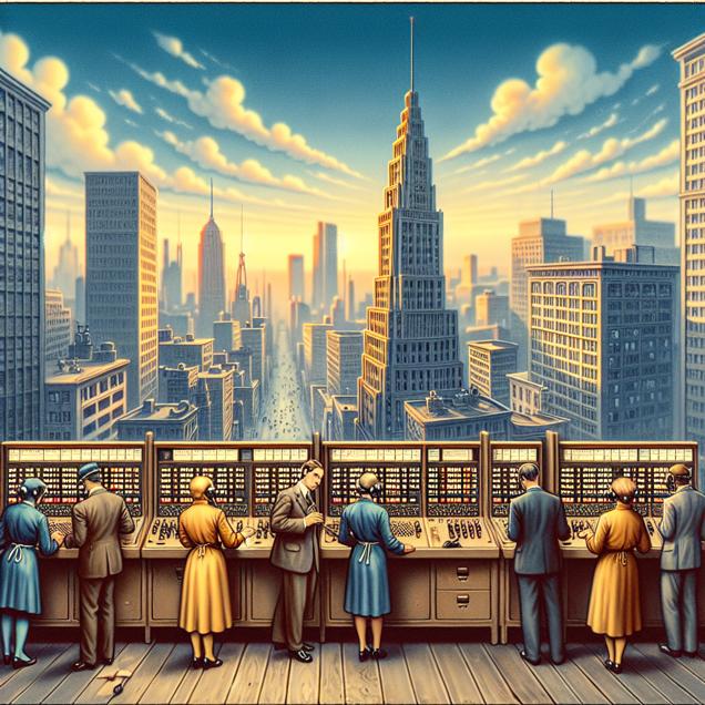 ChatGPT: [ A photo-realistic image ] Create an image of Weirton, West Virginia, with clear blue skies and a sense of modernity in the cityscape. Show the switchboard operators transitioning away from their old jobs, with a nostalgic touch, while indicating a transition towards new opportunities. The image should capture the spirit of technological progress and the promise of a new era without losing the human element of change.