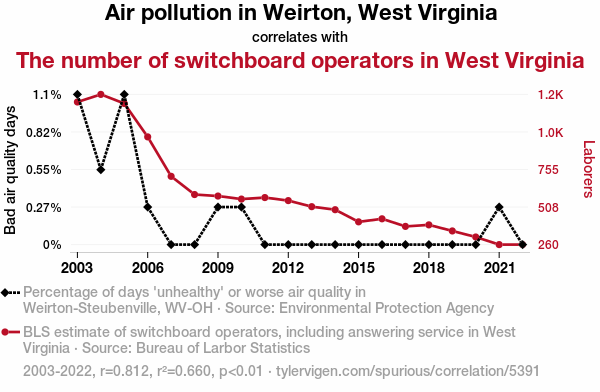 A linear line chart with years as the X-axis and two variables on the Y-axis. The first variable is Air pollution in Weirton, West Virginia and the second variable is The number of switchboard operators in West Virginia.  The chart goes from 2003 to 2022, and the two variables track closely in value over that time. Small Image