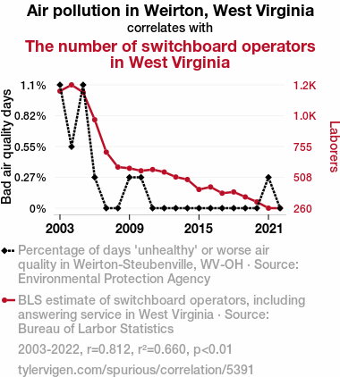 air pollution, Weirton, West Virginia, switchboard operators, decline, correlation coefficient, p-value, environmental impact, labor markets, occupational trends, air quality data, employment statistics, Bureau of Labor Statistics, Environmental Protection Agency