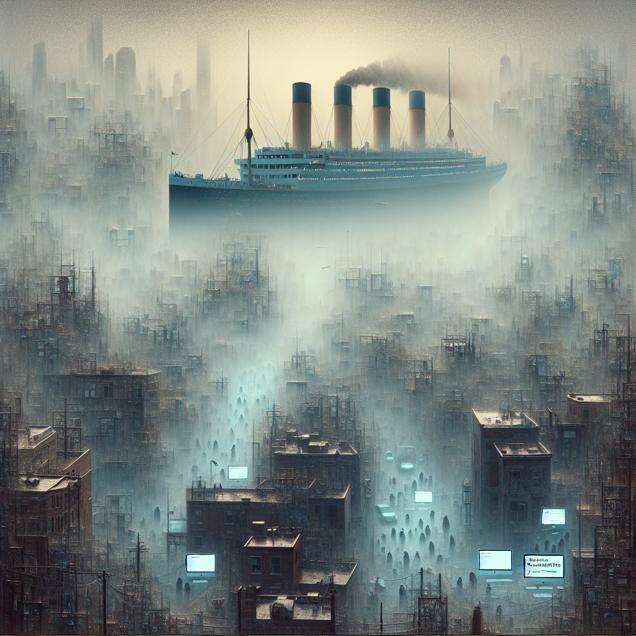User prompt: Please describe a visual scene that prominently depicts both Air pollution in South Bend, Indiana and Google searches for 'Titanic', in the following situation: As the smog thickened over South Bend, residents sought indoor activities to avoid the contaminated air, leading to a surge in online interest in the tragic and iconic shipwreck. Perhaps they were looking for a breath of fresh 'sea' air!. Keep the description simple.