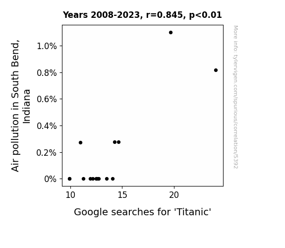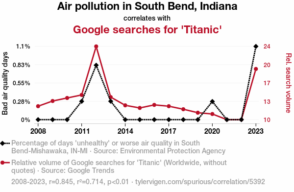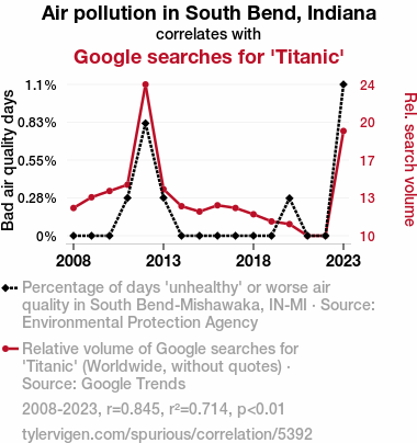 User prompt: Please make up a funny explanation for how an increase in Air pollution in South Bend, Indiana caused Titanic (Google searches for 'Titanic') to increase. Add a funny one-liner at the end.