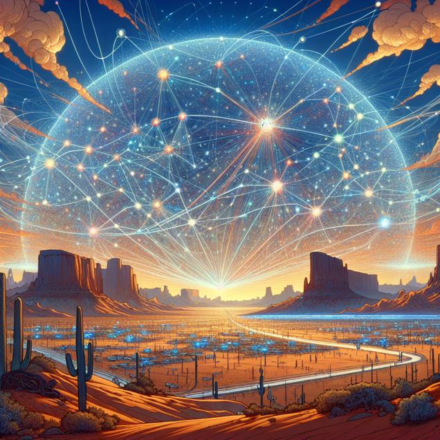 Prompt: Generate an image of a vast, interconnected digital network expanding across the Arizona desert. Each surge in libertarian votes triggers the formation of a new website, represented by glowing nodes connected by intricate, glowing pathways. The network should convey a sense of burgeoning digital independence and unrestricted growth, with the desert landscape serving as a backdrop for this evolving cyber-ecosystem. The depiction should include only scenes, people, and objects, it should not include text or speech bubbles.