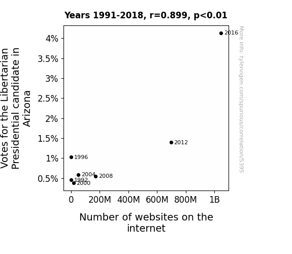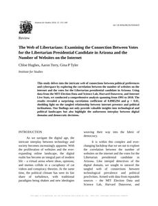 User prompt: Please provide potential search keywords for a paper titled The Web of Libertarians: Examining the Connection Between Votes for the Libertarian Presidential Candidate in Arizona and the Number of Websites on the Internet with an abstract of This study delves into the intricate web of connections between political preferences and cyberspace by exploring the correlation between the number of websites on the internet and the votes for the Libertarian presidential candidate in Arizona. Using data from the MIT Election Data and Science Lab, Harvard Dataverse, and Internet Live Stats, we conducted a comprehensive analysis spanning from 1991 to 2018. The results revealed a surprising correlation coefficient of 0.8985294 and p < 0.01, shedding light on the tangled relationship between internet presence and political inclinations. Our findings not only provide valuable insights into technological and political landscapes but also highlight the unforeseen interplay between digital domains and democratic decisions.