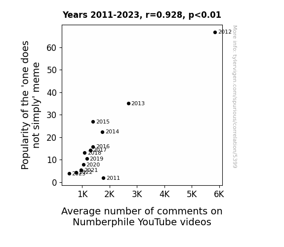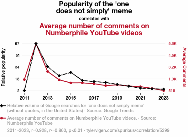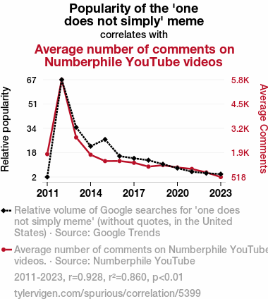 - The spurious research paper: One Does Not Simply Comment on Numberphile: Exploring the Correlation Between 'One Does Not Simply' Meme Popularity and Number of Comments on Numberphile YouTube Videos