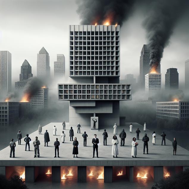 Prompt: Prompt: Generate an image of a brutalist building in Portland, Maine, surrounded by thick smokescreen and flames emerging from smaller buildings while a group of graduates stand proudly with their Associates degrees in Fire Control and Safety. The oppressive smokescreen should dominate the scene, but the graduates should be clearly visible and determined amidst the chaos, symbolizing their commitment to reignite the city's passion for fire safety. The overall tone of the image should convey a sense of resilience against the looming threat of pollution. The depiction should include only scenes, people, and objects, it should not include text or speech bubbles.