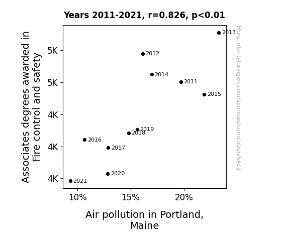 The analysis of a decade's worth of data from 2011 to 2021 has yielded a strong correlation coefficient of 0.8262690, with an r-squared value of 0.6827205 and p < 0.01, indicating a statistically significant relationship between the number of Associates degrees awarded in Fire control and safety and air pollution levels in Portland, Maine. This robust correlation ignited a flame of curiosity within our research team, prompting us to metaphorically fan the flames of inquiry in our quest to understand this unexpected connection.